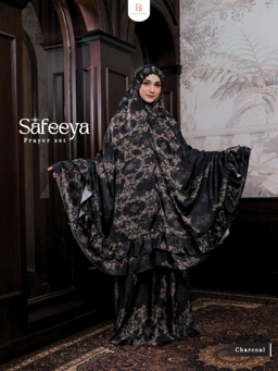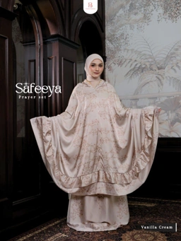Safeeya Prayer Set dirancang dengan siluet jatuh yang lembut dan motif floral eksklusif bernuansa soft dan elegan. mukena ini menghadirkan kesan mewah, tenang, dan sangat feminin.